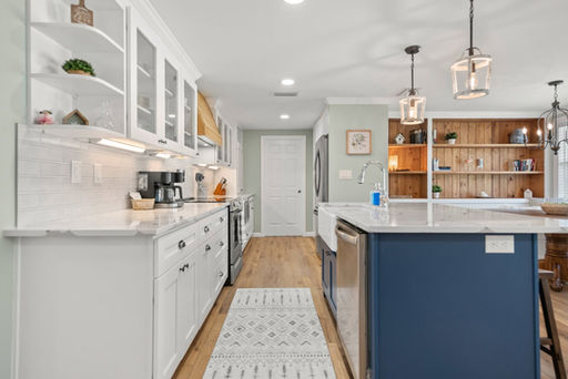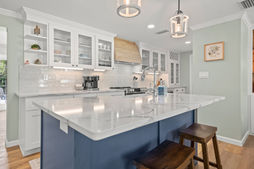 Kitchen Features: Solid wood cabinetry | Island with farmhouse sink | Level 4 Cambria Quartz countertops | Custom wood vent hood | New tile backsplash | Stainless steel appliances
